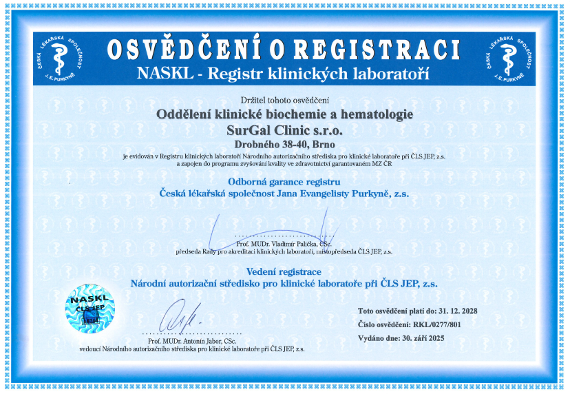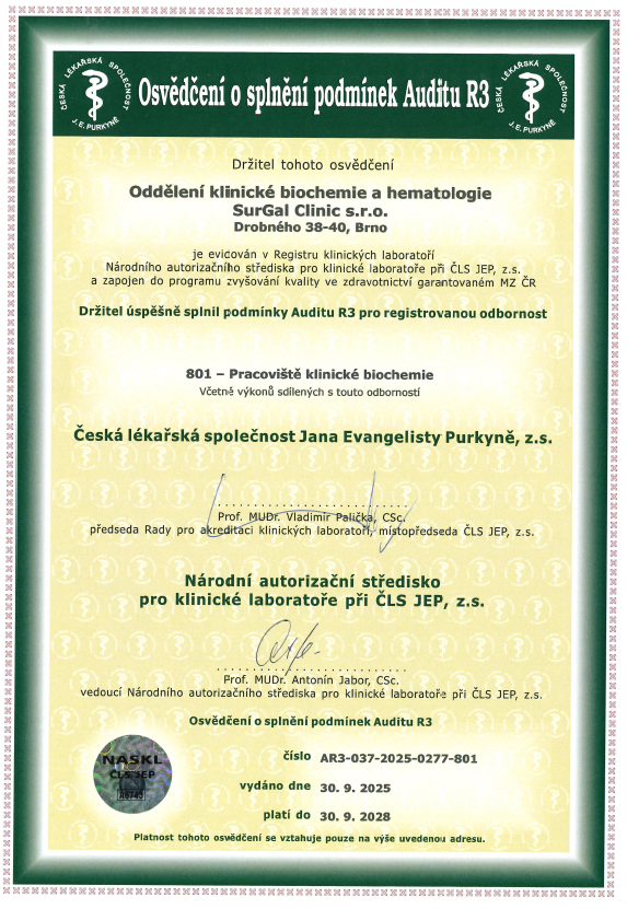 Laboratoř je držitelem osvědčení o splnění podmínek Auditu R3 vydaného Národním autorizačním střediskem pro klinické laboratoře při ČLS JEP.